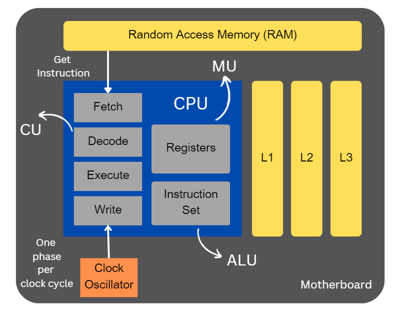 At first, this instruction is fetched from the memory into registers on the processor. Registers is the memory in built on the processor for quick access of the instruction. Memory Unit (MU) manages this memory.